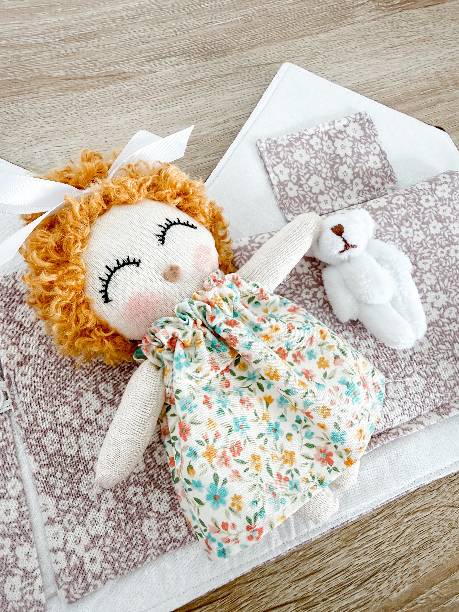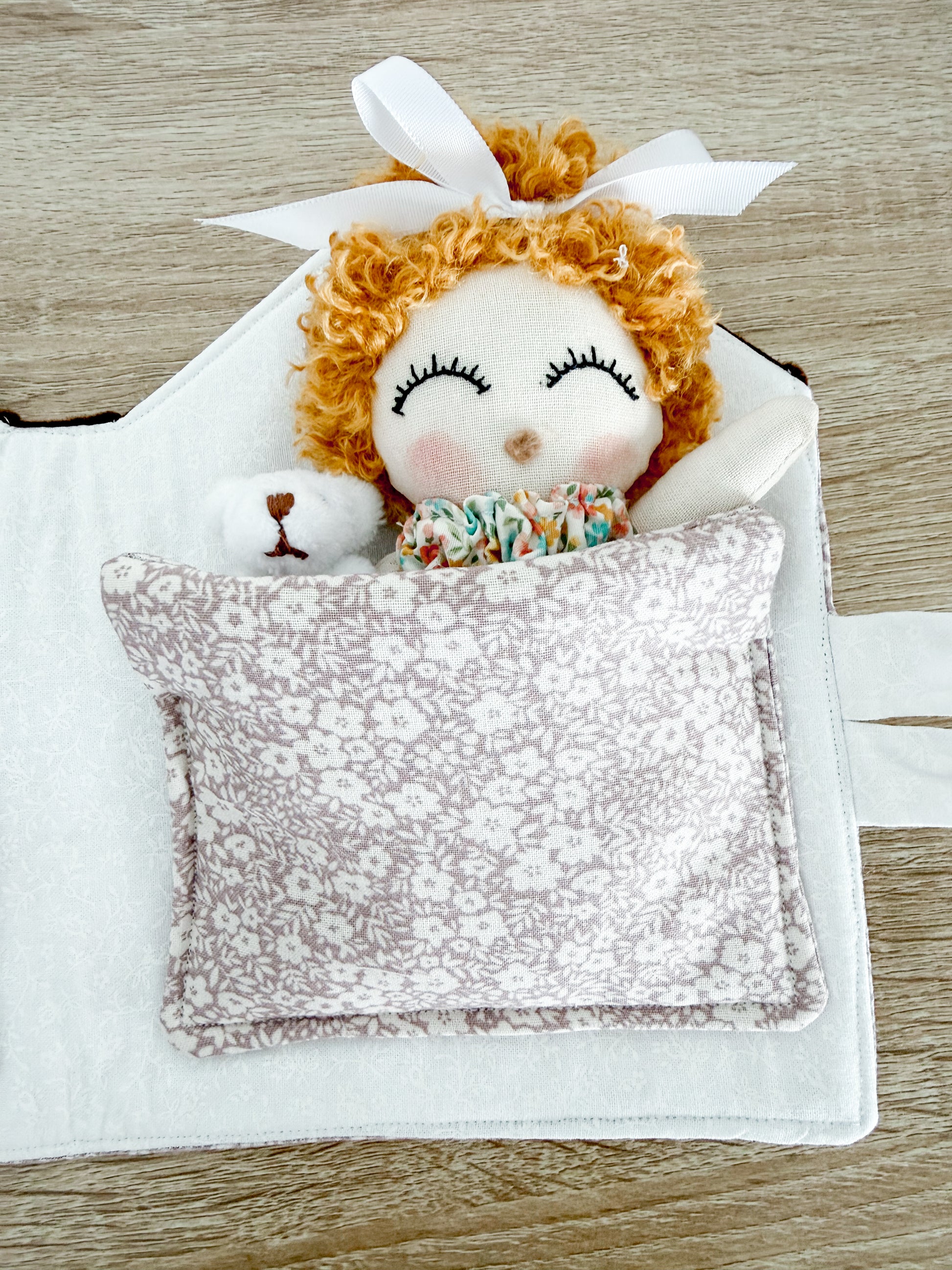 ♡ A fabric home, complete with an attached pillow and blanket, the blanket has an opening to tuck your little Dolly in snug.